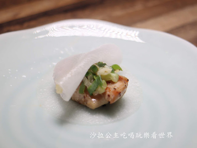 好吃的千枚漬我就拿來包雞肉和鹽蔥,滋味真的是太讚了,千枚漬的口感超細緻,帶點酸甜,沙拉上下都夾了一片中間夾入鹽蔥,口味上很有層次
