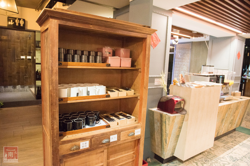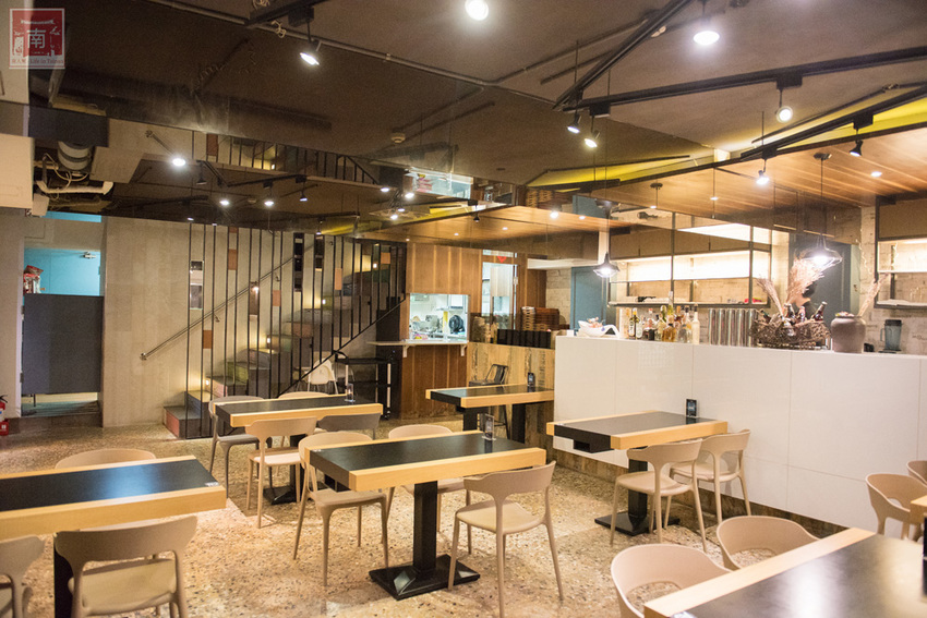 環境規劃及設計不假他人之手,全部都來自建築設計師老闆的構想,原本的磨石子地板,在牆上也有一個鐵花窗,保留著一些舊元素,燈光屬於黃色燈光,光線較柔和,燈飾則使用簡潔的投射燈和具設計風格的燈光,另一邊則是鐵皮材質的牆面,桌椅則以黑色和木色系做搭配,顏色簡單又不失莊重。小包廂的牆面則畫上府城街景,也因為這棟建築的前身是一家台南知名的老咖啡館,所以當坐在裏頭吃飯、喝咖啡,再看到牆面的台南彩繪,彷彿時光倒流,當再聽著音樂,心情更加安靜。