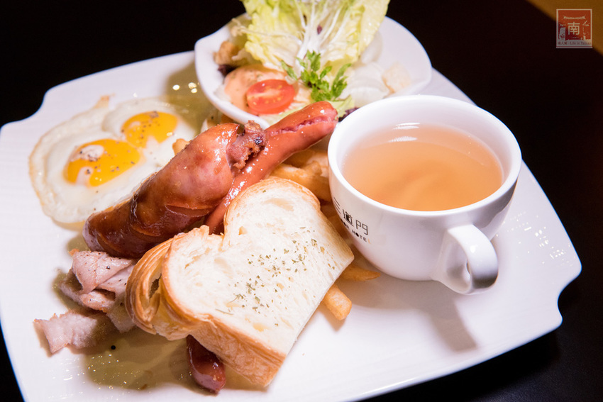 滿有趣的名稱,有兩顆合格認證雞蛋煎的荷包蛋,也有在地小農配合的生菜,再搭配吐司和煎過的松阪豬、帶骨香腸、德式香腸,香腸脆口,松阪豬有咬勁,滿滿煙燻的香氣,吃起來帶點油脂但不油膩,還搭配菌菇清湯和炸薯條,當然還有咖啡、飲料喝到飽,算滿超值的。