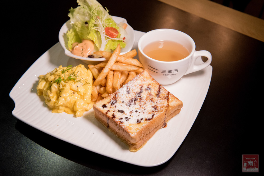 看起來超像下午茶的,咖椰醬吐司算是在法國當地很有名的美食,有點類似法國吐司的作法,上頭沾附著可可焦糖和糖霜,內餡則是兩種起司,吃起來鹹甜鹹甜口感,炒蛋也是用認證過的雞蛋炒的,搭配生菜、薯條、菌菇清湯,我想女生會滿愛這一道的吧!這也是三道門主管愛的一道。