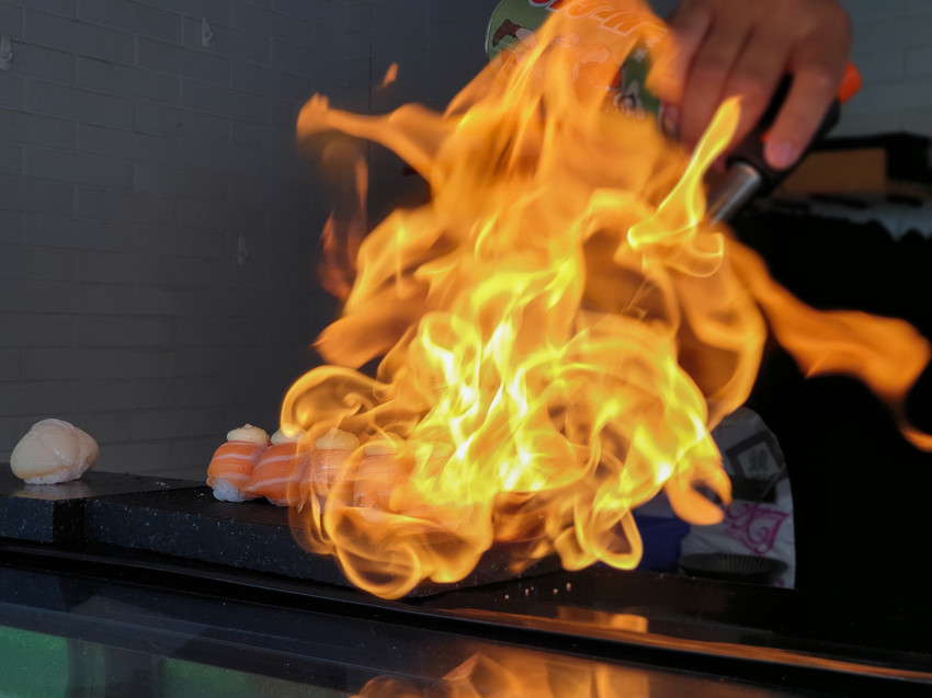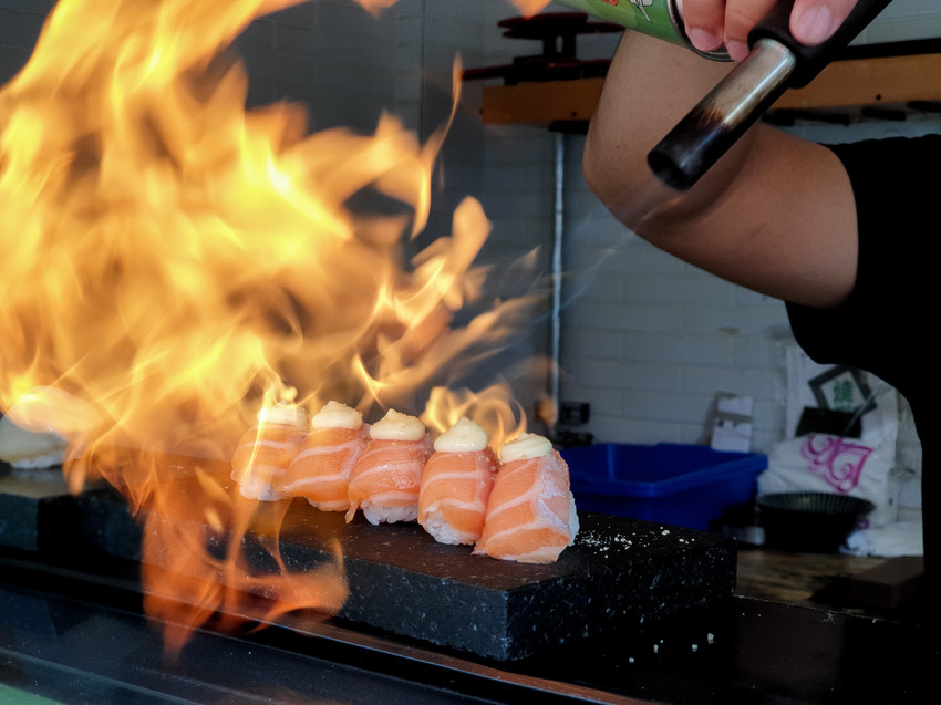 炙燒中的鮭魚好療癒,雖然一開始被大火嚇壞了(笑)