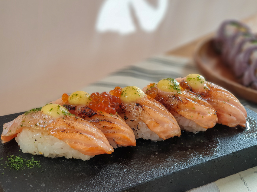 最近掀起一陣鮭魚壽司風潮,台南近期出現了不少。