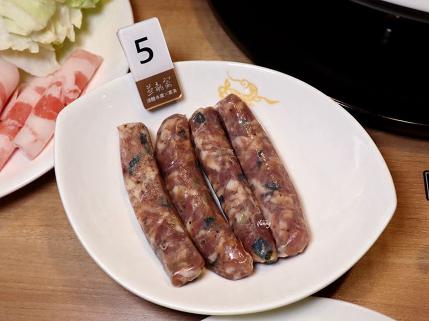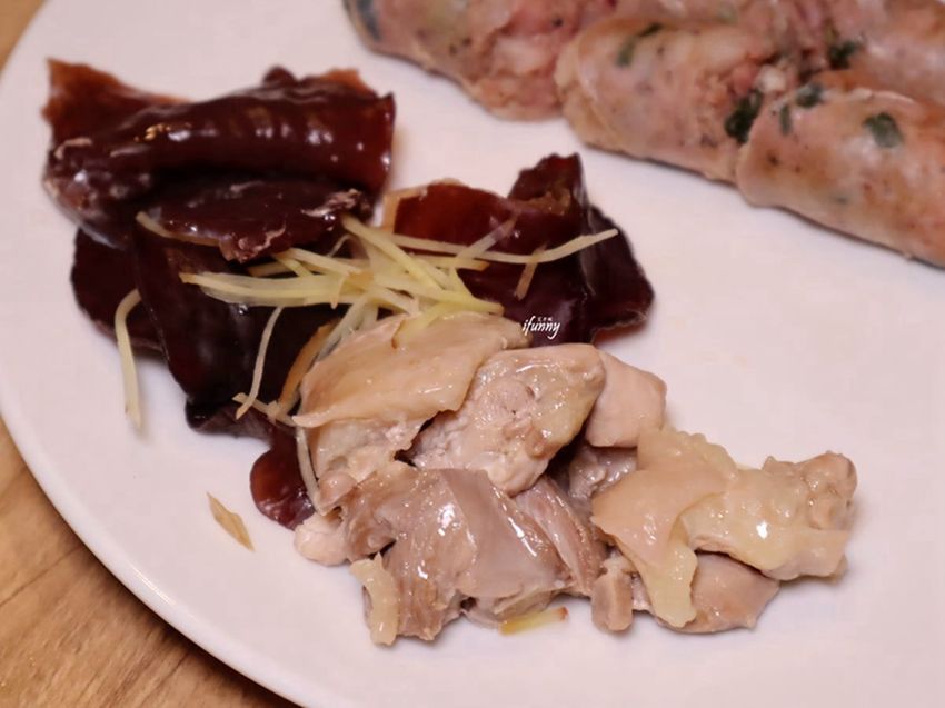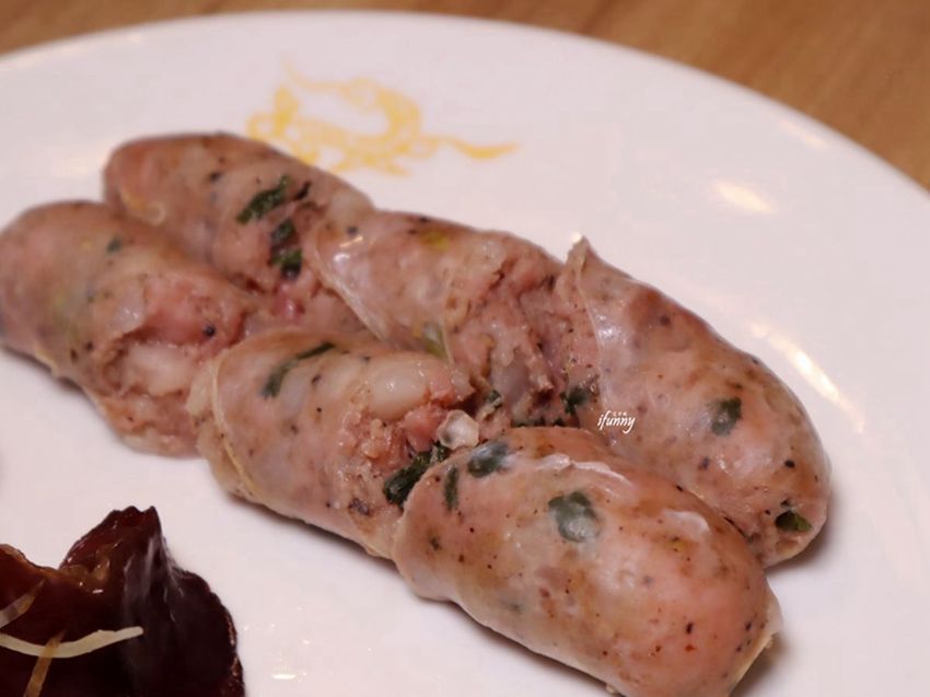 這青蔥香腸是首訪時就嚐過的好味道,一般香腸不是要烤得油亮亮嗎?但這香腸在蒸龍宴當然是用蒸煮的啊。