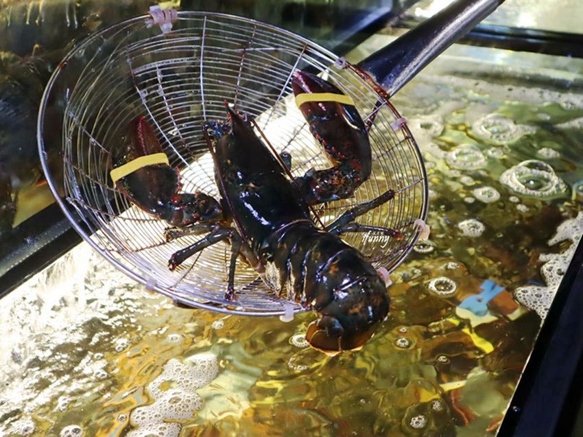 有著細長的藍色大螯的蝦公,鮮豔的色澤更是新鮮的說明。這是當然的啊!剛剛才從水族箱中撈起的啊!