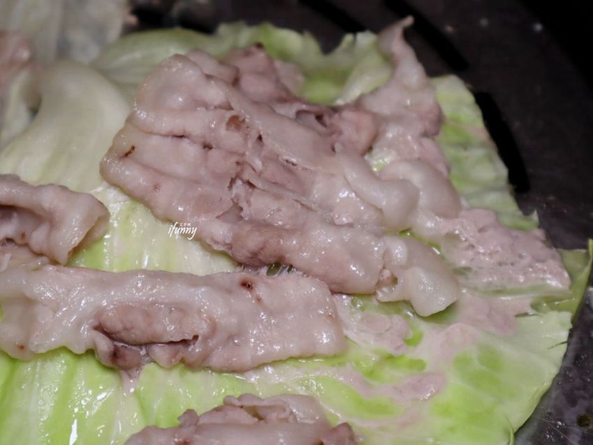 瞧瞧這豬五花經過四分鐘的蒸煮後,油脂自動化開來,整片肉散發著油亮光芒,而油脂也滲透到高麗菜之中了!