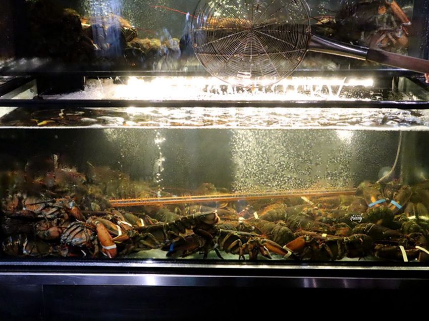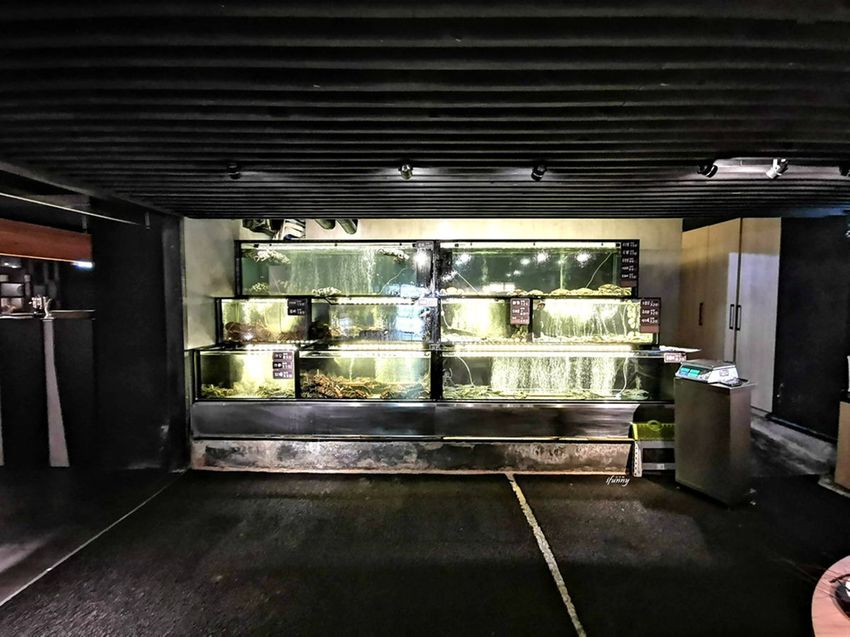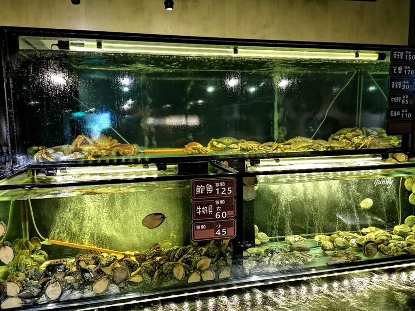 這天巨大水族箱中的活體水產,有波士頓龍蝦/帝王蟹/毛蟹/黃金蟹/虎紋石斑/鮑魚/牛奶貝/泰國蝦‧‧‧等。都是視當天進貨來訂價,價格都很合理。