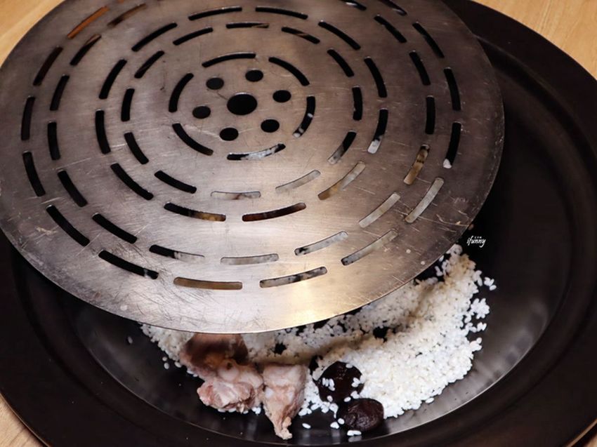 接著放上蒸盤,然後再來蒸煮的每份食材產生的湯汁,都會透過蒸盤上的孔洞流到下面的米飯中,所以最後這米粒將吸滿了各種食材的精華,沒有加一滴水,是不是超期待的呢?