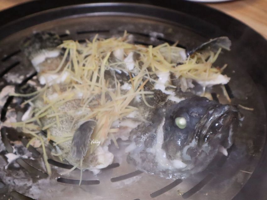 沒有任何調味,開鍋蓋時薑香味十足!肉眼就可辨識的膠質豐富啊!沒什麼魚刺的虎紋石斑,魚肉細緻鮮甜,真是太好吃了!愛吃魚頭的艾方妮更是不放過這樣的機會,滿滿的膠原蛋白及Q彈的魚頭肉,那是魚的精華所在啊!吃完整條魚,看不出牠原來的形狀,這才是真正對得起這條魚的奉獻,好嗎?呵呵!