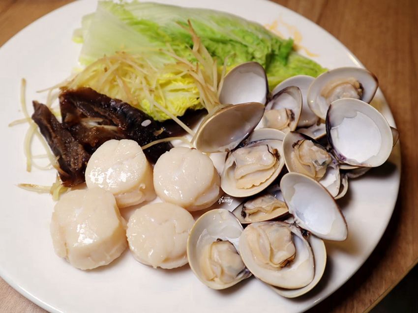 這一盤蛤蠣、巴西烏參、娃娃菜及干貝,即將成為我們的第一蒸。