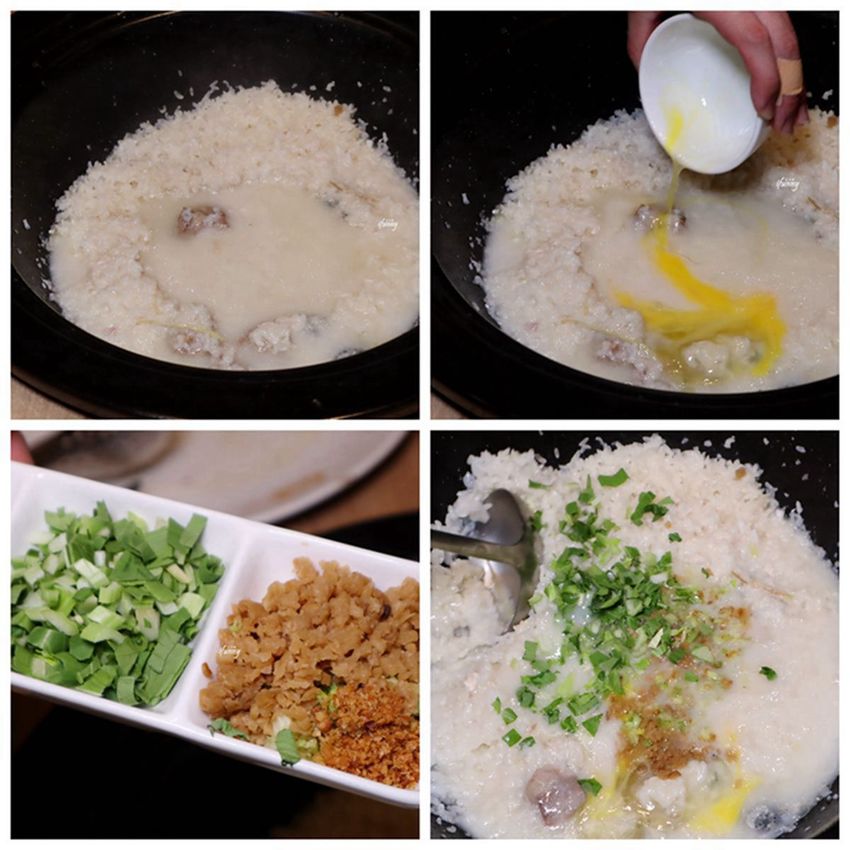 在介紹所有餐點前一定要先介紹這個粥底,另外三格盤上的蛋、青江菜、蘿蔔乾、芹菜末及蒜酥,是最後煮好粥時才加的。