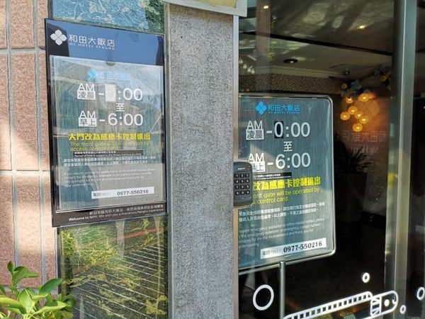 環繞一圈,覺得和田大飯店現在實施多項的節約措施,而在凌晨整點到早上6點的時間,出入可都是由房門所提供的感應釦進出。