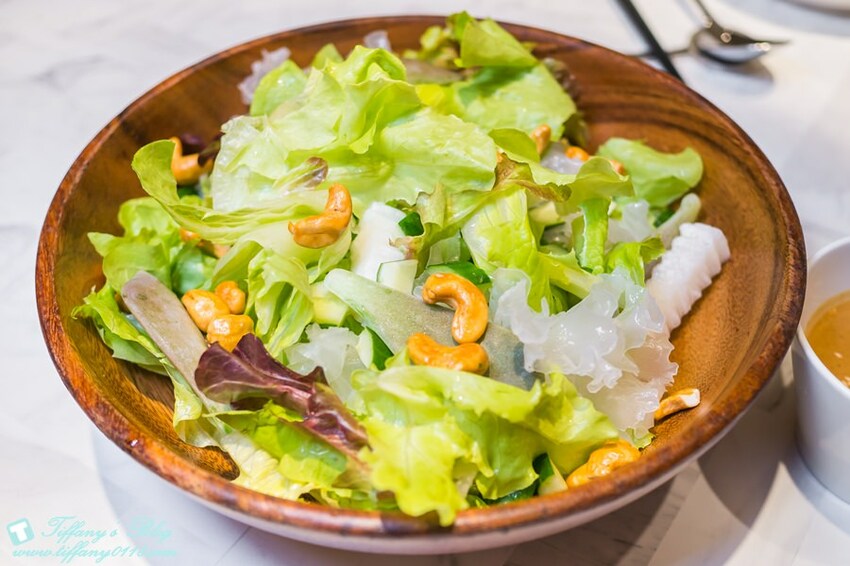 利用木盆裝入山藥、小黃瓜、白木耳、紫色高麗菜、腰果..等食材