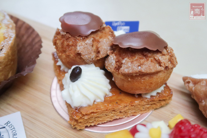底層的千層酥皮真的好酥,刀子一切都是酥脆的聲音,聽了就很舒服,酥皮上有抹上一層小編不確定是什麼醬汁,泡芙裡頭是空的,不是扎實口感,泡芙上還擺了巧克力塊。
