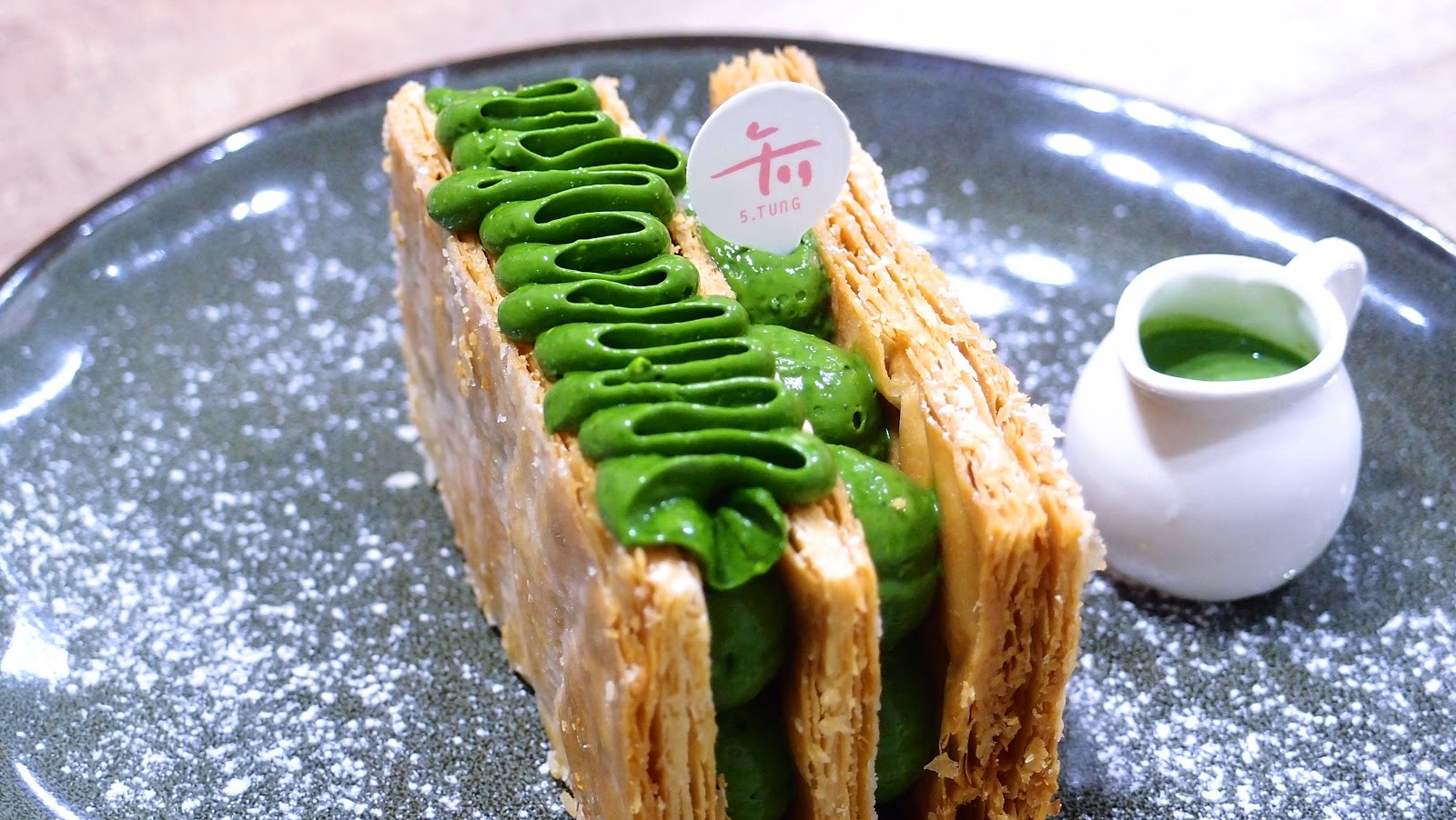 食畢俯視盤中,千層的落下,推開的茶醬,畫面金綠交織,甚美。