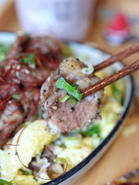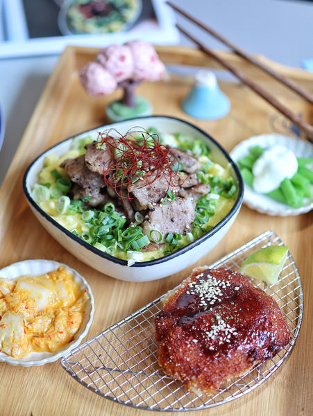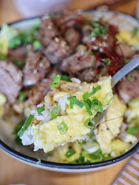 ▫️白米飯上滿滿鋪蓋著金黃色的嫩蛋與新鮮蔥花,淋上特製的烤肉醬汁香氣濃郁,上頭放上份量多到疊成一座小山的牛肋排,帶有豐富油脂的部位嫩口、微帶自然的嚼勁,調味上有點鹹豬肉的感覺,相當下飯!另外有附上兩盤小菜,涼拌四季豆、黃金泡菜,搭配著吃不僅解膩、爽口開胃啦。