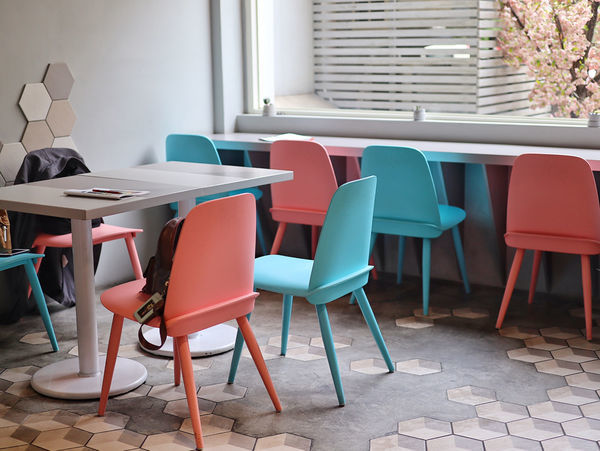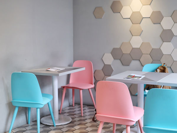 內用的座位數不少,前頭是粉色與水藍色座椅區,