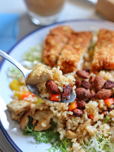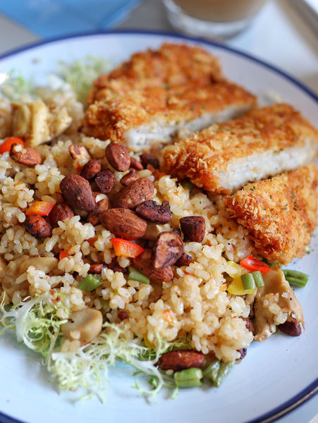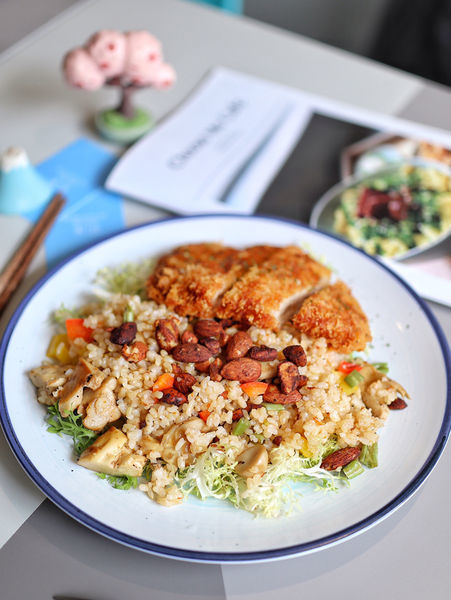 ▫️這大概是我吃過最健康的中式簡餐了,因為我自己本身還滿喜歡糙米的,所以接受度100%!很多人不愛糙米有點粗粗硬硬的口感,但是初米使用蒸煮處理的很棒,微軟濕潤,入口不說的話完全不覺得是糙米。佐以杏鮑菇、彩椒、四季豆、堅果等自然養生的食材拌炒,添加豐富口感,下方還有鋪上生菜,不僅美觀又能補充纖維質。主菜的話有炸豬排、炸魚排、雞腿排,也有單純素食的選項哦!今天選的是豬排,炸得乾爽不油膩,有厚度、肉質的紋理細緻好入口。