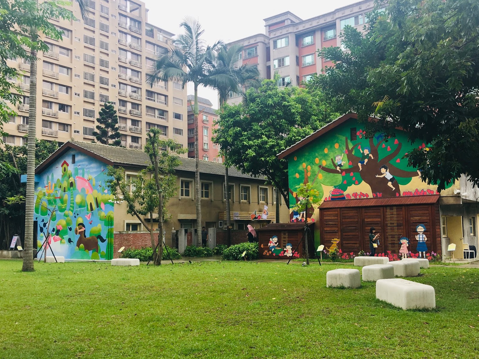 園區內也保留了,以前的老樹同時也重新整理成一個舒服的公園環境,在這個大樓環繞的住宅環境中,多了一分綠意,這附近也很寧靜,跟IR資深天龍國人平日活動的地點很不同,這裡也有很多小朋友,南崁兒童藝術村讓小朋友們假日能夠放電與課外學習的好地方,這個用意真的是很不錯。