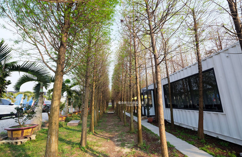 左邊有流蘇花,右邊有落羽松和白色貨櫃屋