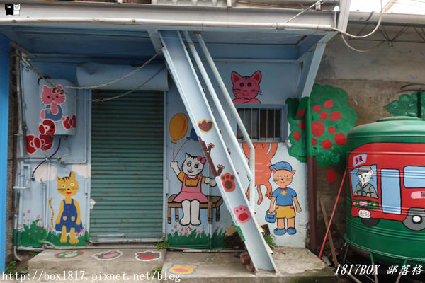電視卡通角色加菲貓、湯姆貓也都在這裡出現,將巷內的窗框、水管、洗衣機、小花雜草融入彩繪背景裡。