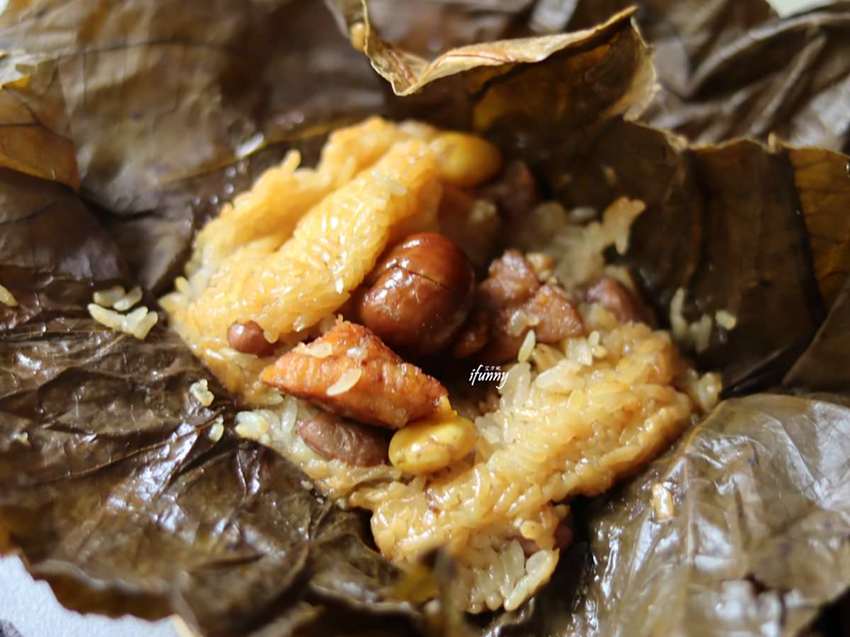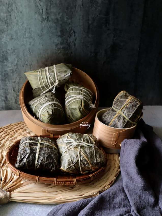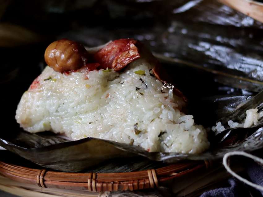 先將長糯米泡水八小時,再放入蒸籠內約五十分鐘,最後搭配青江菜以中火拌炒。素粽內餡選用鳳眼果、栗子、山藥及筍丁等食材與紅糟一同拌燒,將食材的美味完全鎖在素粽中。這個素粽很得艾媽的歡心呢!