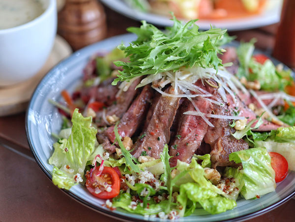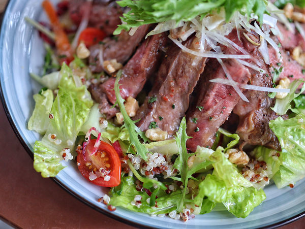 ▫️泰式醬汁的生菜沙拉很有異國風,甚至點綴了些口感極佳的青木瓜絲。有明顯厚度的切片勒眼牛排,熟度大約5分,帶點粉嫩的誘人色澤,友人表示:肉質柔軟、微帶嚼勁。而撐起這片牛肉森林的是一份煮的軟Q濕潤的花蓮黑米,就算點沙拉也不擔心吃不飽了。