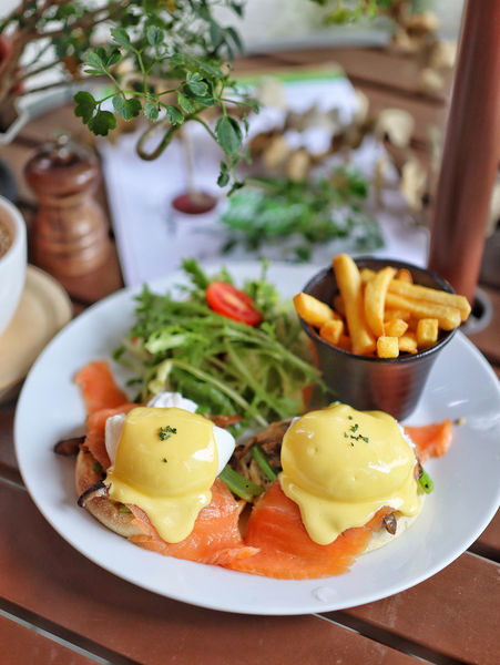 ▫️雞蛋控我本人對於各種蛋的料理都很有興趣,班尼迪克蛋是寵妃之一,因為一個好的班尼迪克姑娘可以帶你上天堂,班尼迪克蛋的靈魂則是荷蘭醬,畢竟這醬本身也是蛋黃做的,蛋配蛋絕配。Jerry家自己做荷蘭醬,微微的自然酸度溫潤爽口,香氣十足,選擇搭配配的是柔軟的燻鮭魚,在其英式馬芬中間夾入脆口的綠色蔬菜與炒菇,口感豐富活潑。切開後流瀉下的半熟蛋液,是最美好的畫面之一。
