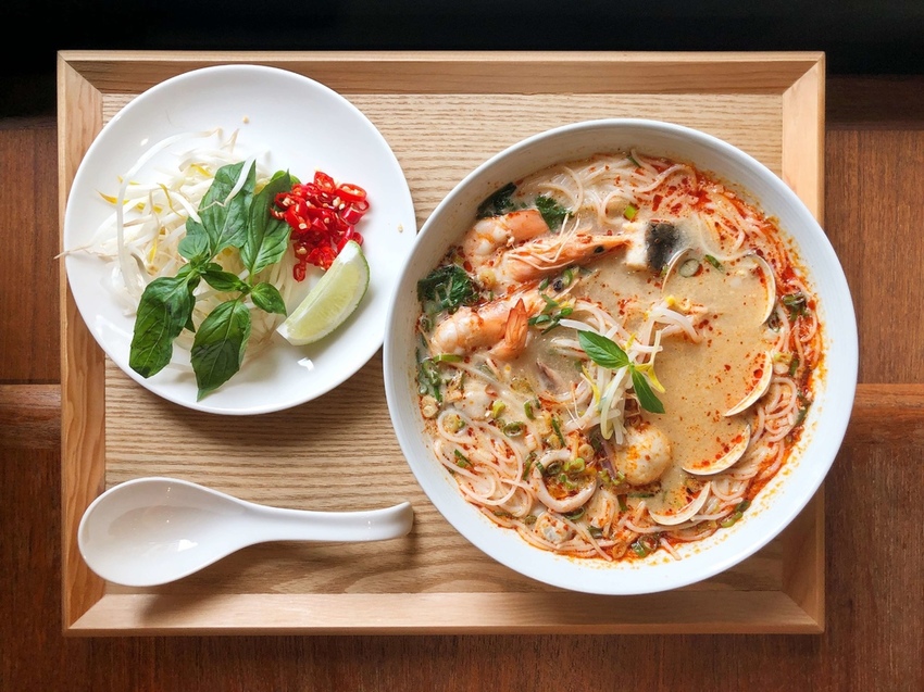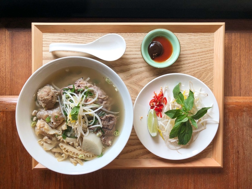 由於湯頭味道偏淡的關係,重口味的朋友可以搭配越南辣椒醬和醬油膏,以1:1的方式加入湯裡,還可以將菜盤酌量放入。