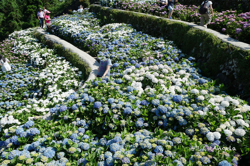 陽明山竹子湖地區有好幾家繡球花田可以參觀,大部分都有收入園費100元,有些可以折抵園區消費,有些是純清潔費。如果你喜歡有小油坑當背景,看似日本鄉下氛圍的花田,建議來大賞園繡球花園賞花,這裡的花色有唯美的純白,還有豔麗的紫紅,常見的水藍色也有喔!