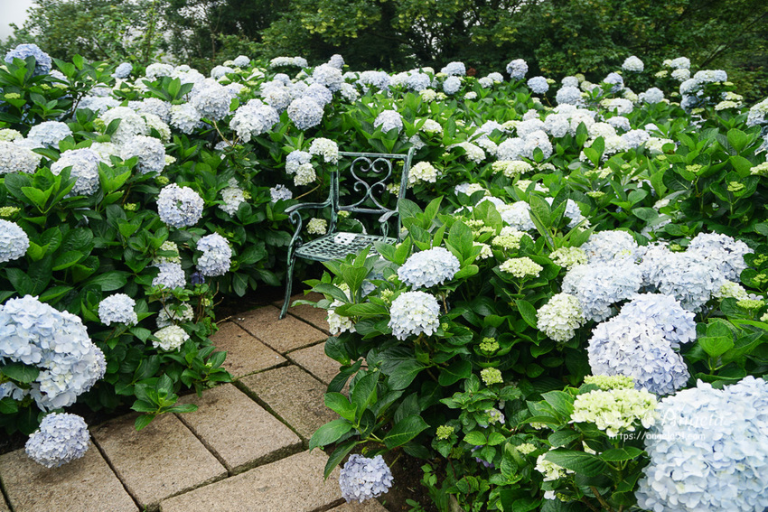 想要跟繡球美近距離拍照,又不用擔心破壞花叢,可以來花與樹花園賞花,園方貼心的在花叢中擺好了椅子,遊客只要美美的坐下就可以拍出在花海中的感覺。