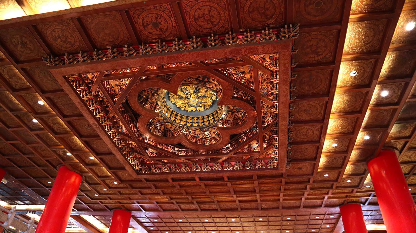 梅花藻井:圓山飯店大廳中央上方有一梅花造型的藻井,梅花中央五條金龍環繞一顆龍珠,意味「五福臨門」;藻井內周圍有23條金龍、16隻鳳凰,取其「3」諧音「升」意指步步高升,「16」伴隨大梅花「發」,則有一路發之意。