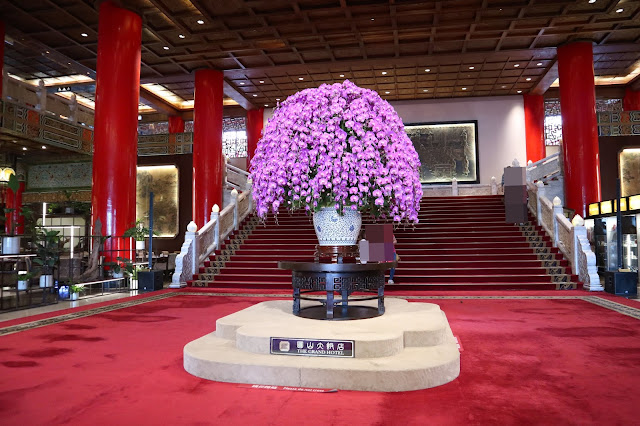 大廳正中央擺放著一盆高貴蘭花,讓圓山飯店的氣質更上一層樓。