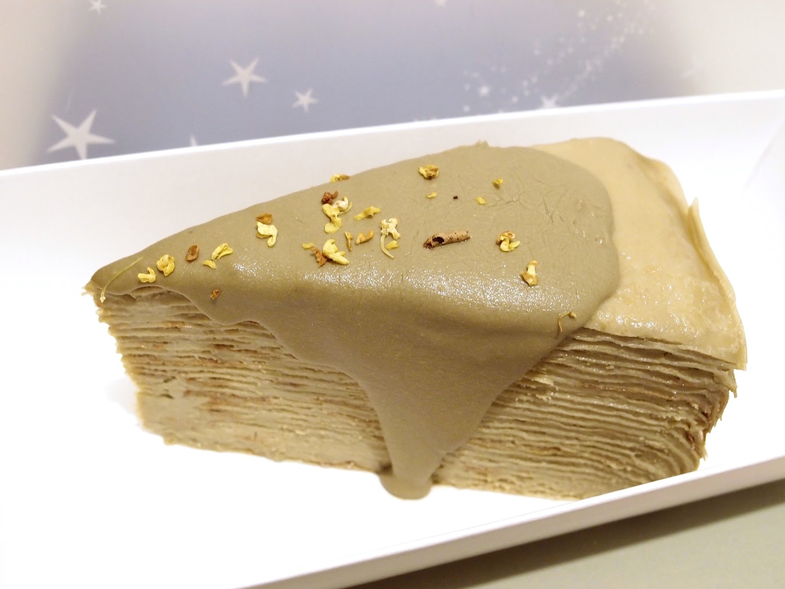表層綴以桂花的鐵灰色淋醬,有一些沙沙的口感,伴隨著濃濃的、令人安穩的烏龍茶香。
