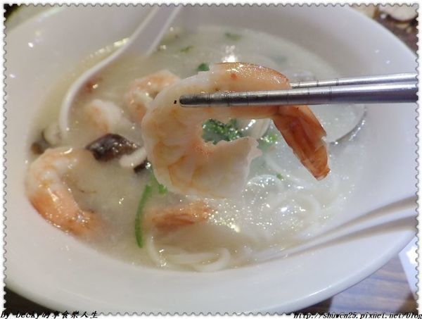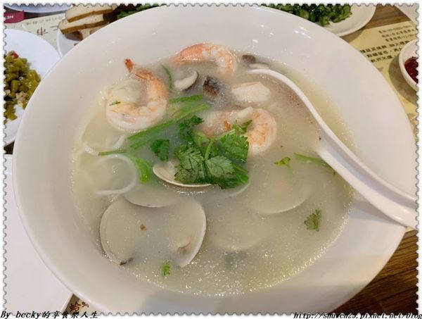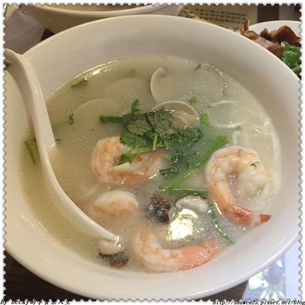 這碗有鮮蝦、蛤蜊,濃郁的湯頭中泛著海鮮油脂,裡頭還灑上少許香菜來添加香氣,讓食指大動呢!