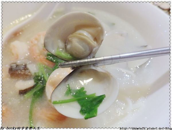 新鮮蛤蜊蒸熟後只取其肉與湯汁,並與香菇、蒜蓉、蔥末拌炒後融入湯頭,蛤蜊大顆多汁,入口鮮甜。
