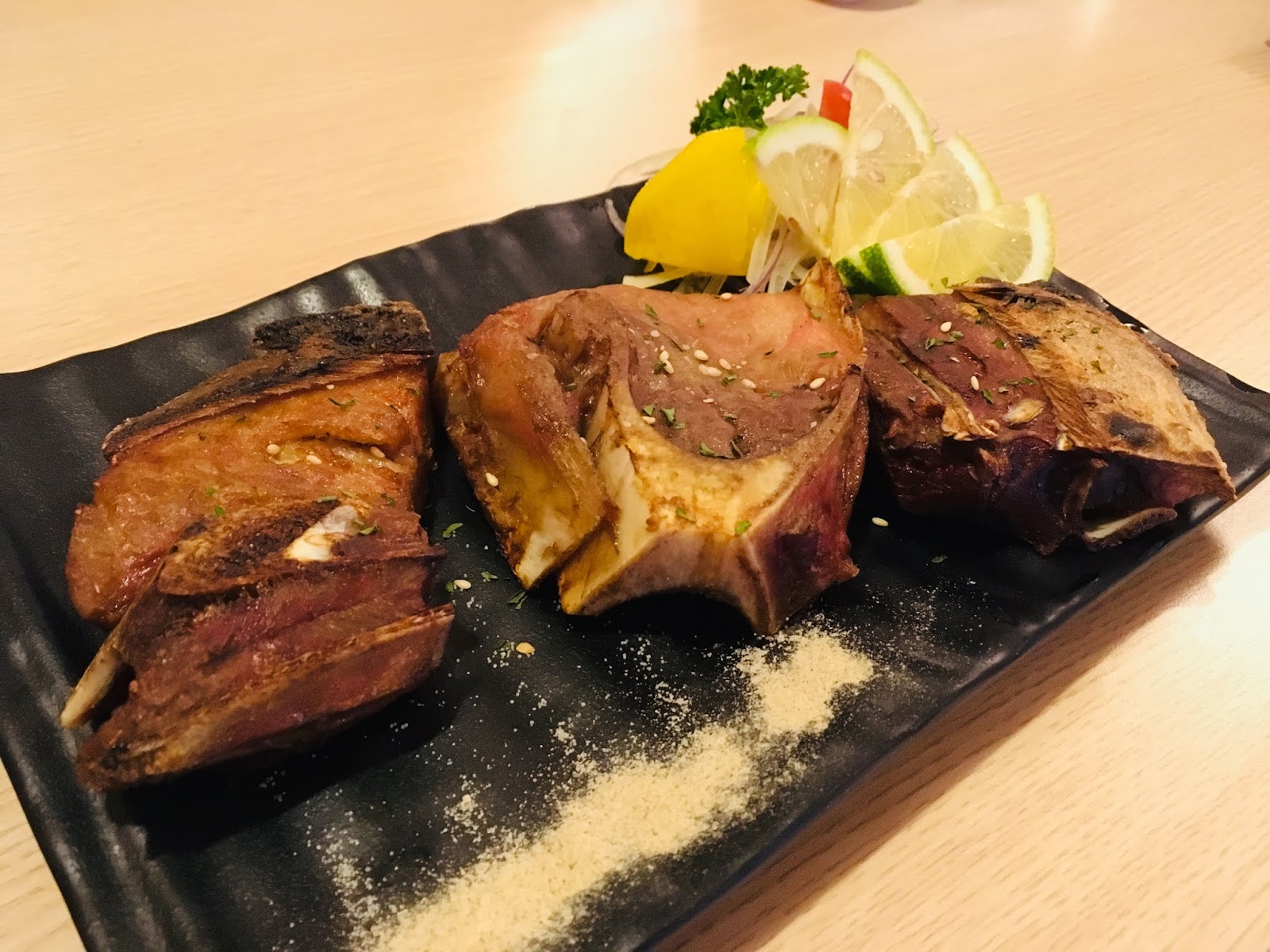 「極品黑鮪魚」是有捕獲才提供的頂級極品,來店想吃得看運氣,不一定每天都有。黑鮪魚料理方式不是常見的生魚片,而是採燒烤的做法,炙燒過的微焦外皮飄散著魚油香氣,完美鎖住黑鮪魚肉汁,肉質咬下豐腴鮮美。老公直說想不到燒烤黑鮪魚是這樣好吃!是讓我們很驚喜的絕美滋味。