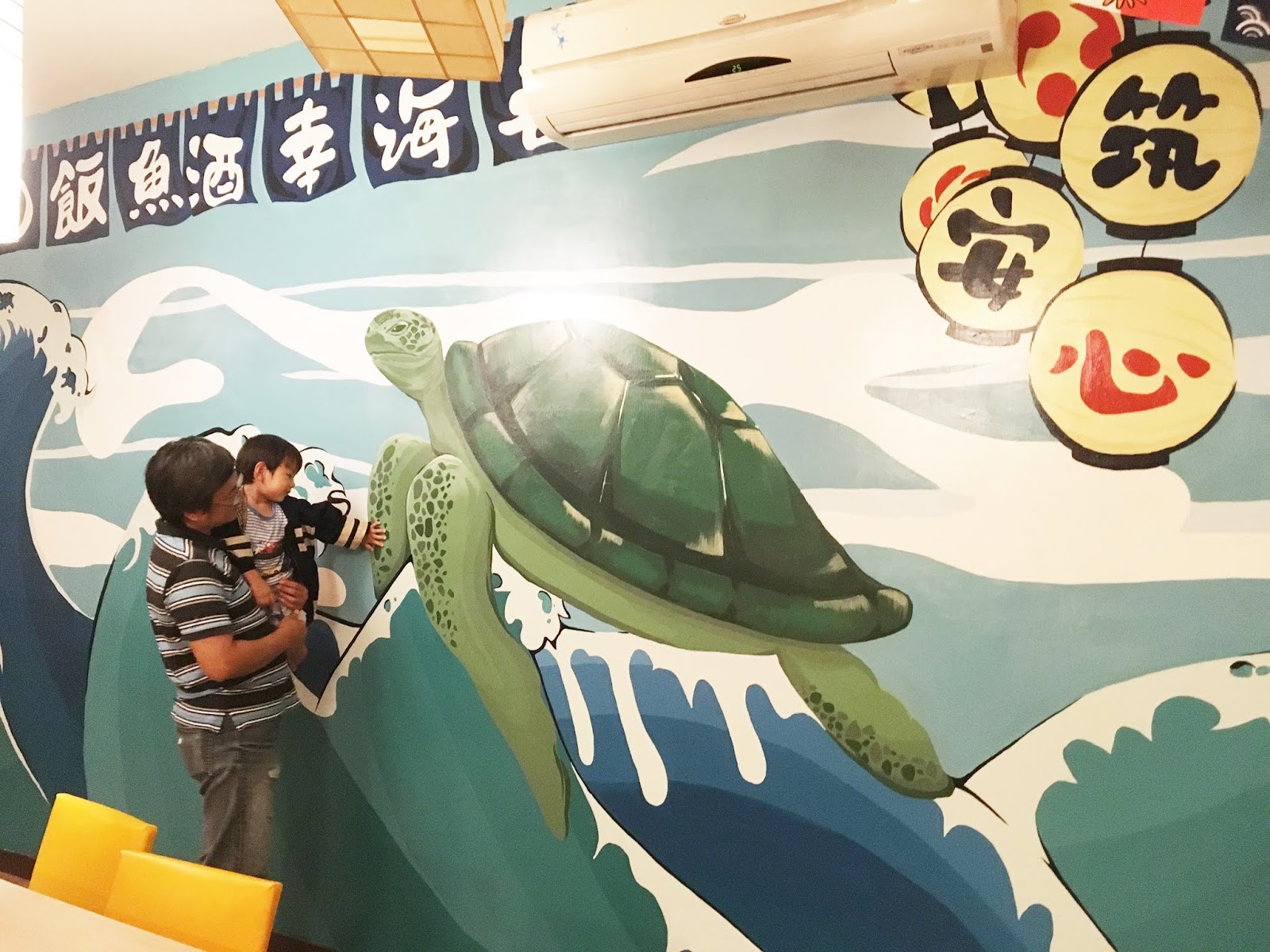 海龜是在小琉球很常見到的代表生物,孩子們都很喜歡牆上大大的海龜壁畫,小福寶也跑來摸摸看。