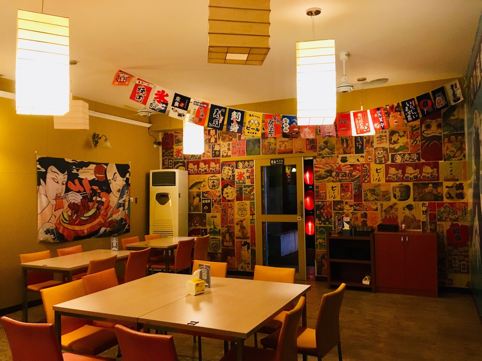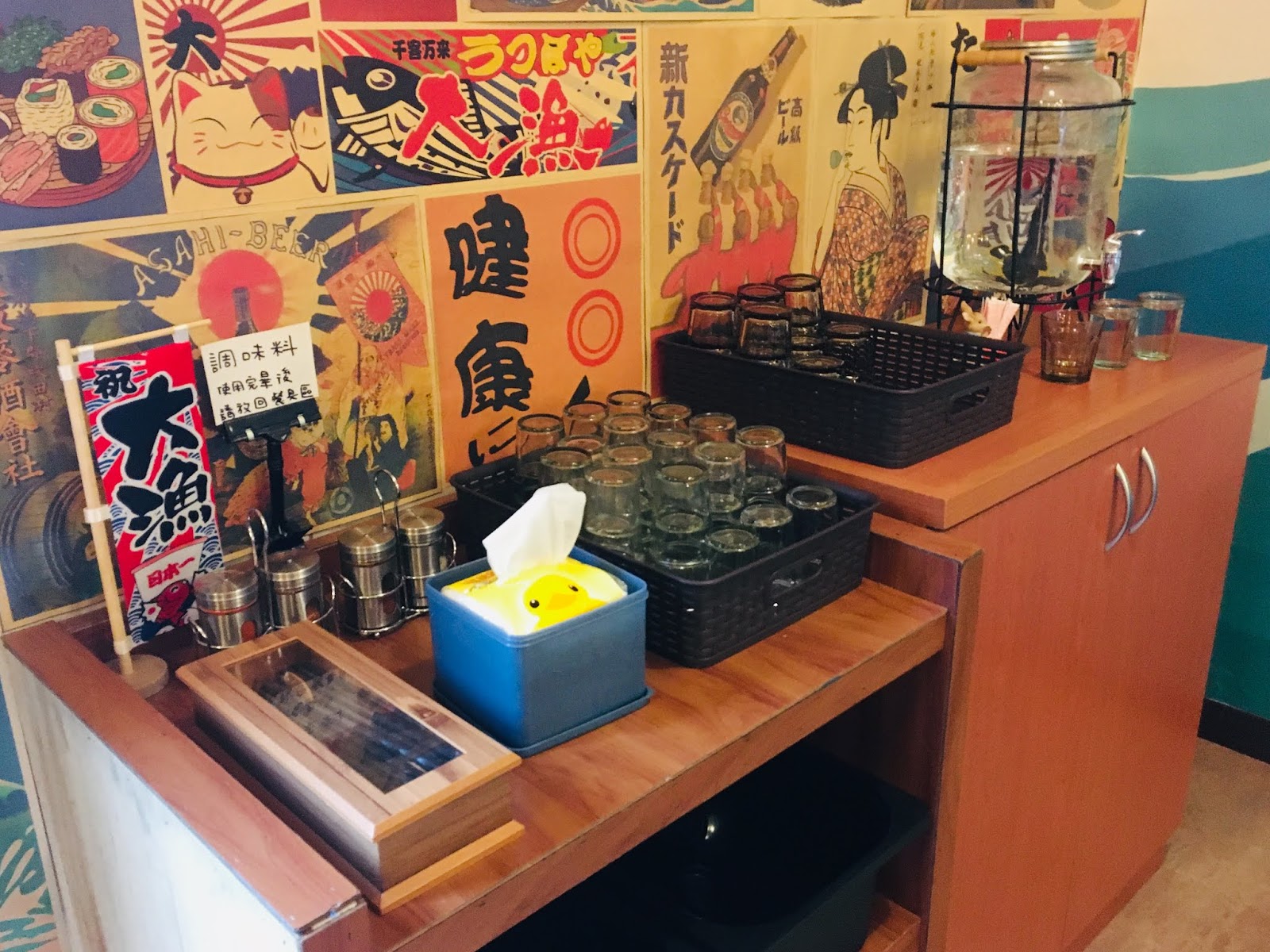 店內大量使用日式風格的素材做裝飾,像是浮世繪、旗幟、招財貓等,日式燈籠散發的燈光溫暖而明亮,有居酒屋的氣氛,又不會太暗,是相當舒服的空間。