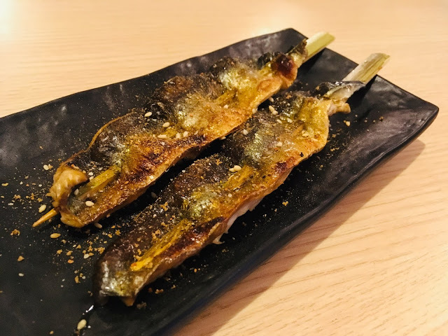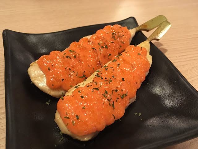店家超推薦的「明太子雞肉串」,是在無骨雞肉串上大方抹上一層厚實的明太子醬,有雞肉的軟嫩多汁和海味的濃郁鮮甜,奢侈的海陸口味串燒,讓大人、小孩都好愛,小福寶吃完一根後還嚷著要吃。