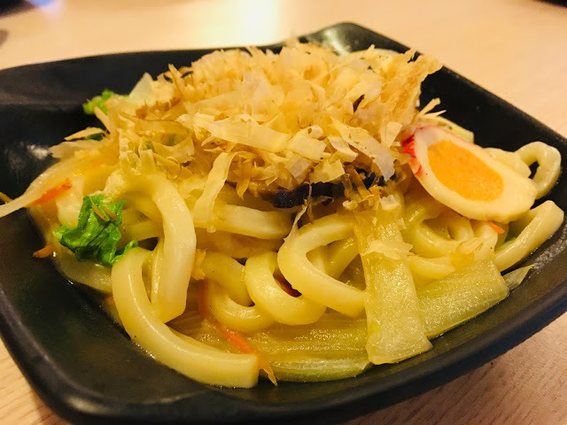 「松阪炒烏龍」的松阪豬肉片又嫩又脆,順著Q彈的烏龍麵一同吃下,依附其上的時蔬和柴魚增添了口感和香氣,有像在口中跳舞一般的好滋味。