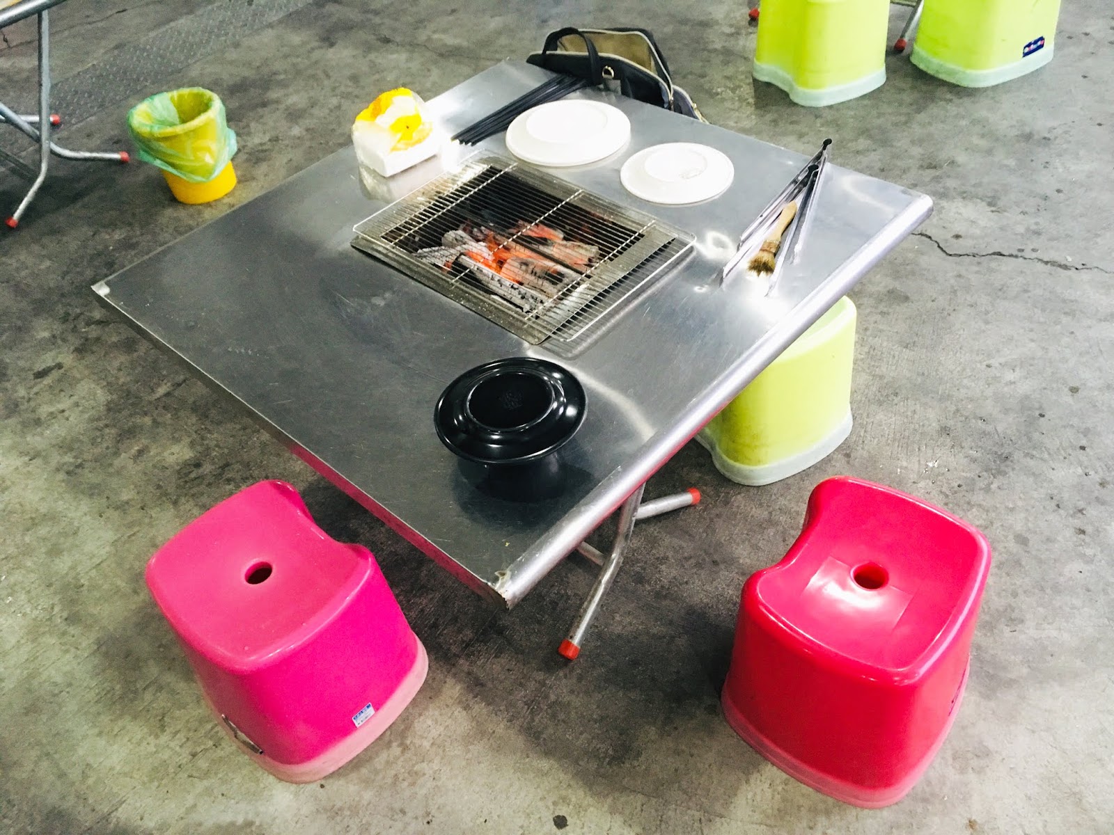 我們入座時,餐具、特調烤肉醬和燒得火紅的炭火已經準備好了!在屋頂有加裝抽風裝備,旁邊也有電風扇幫助通風,沒有過多的煙霧。