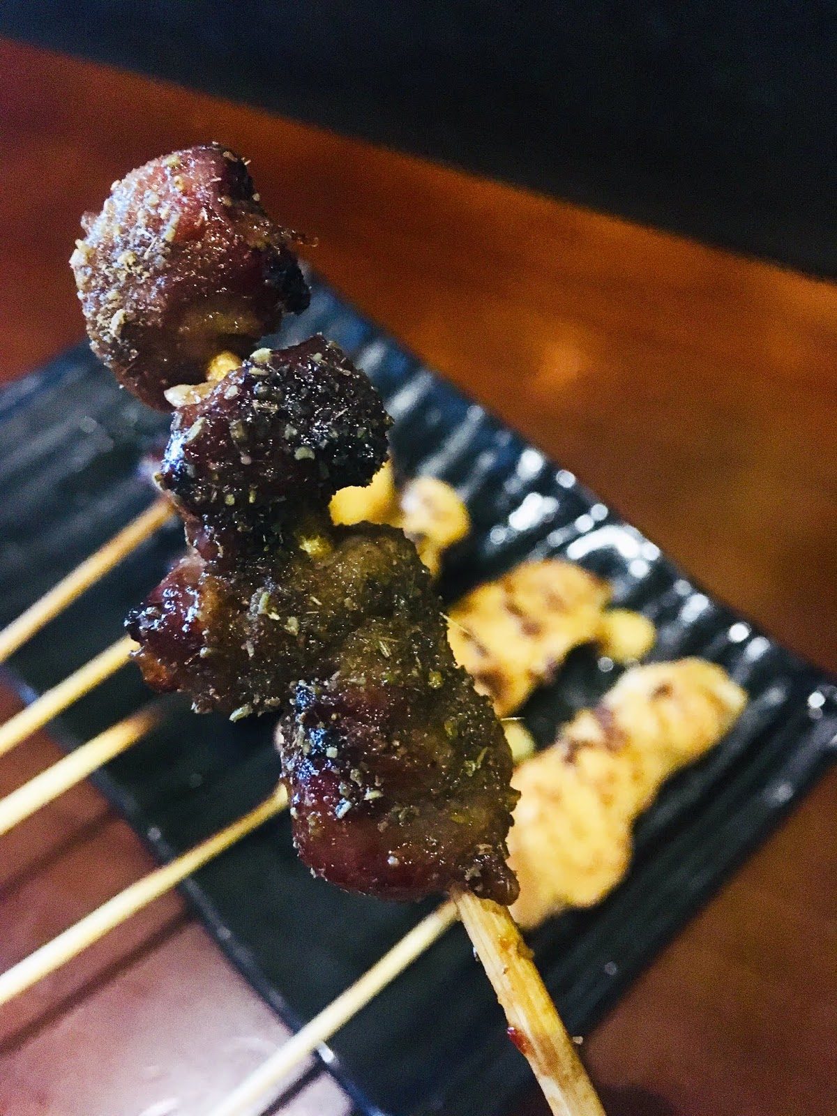 我很喜歡新疆口味的孜然香氣,點了孜然羊肉串,店家非常推薦明太子系列,於是我們另外點了明太子雞肉串、明太子牛肉串。