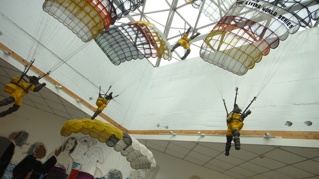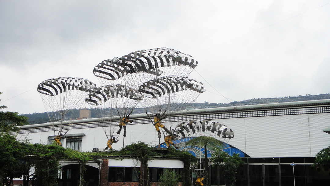 朱銘美術館也有室內的展出空間,這次室內展出空間,展出各種軍人的形象樣貌,不同的是利用保麗龍,多種可塑性素材去呈現主題。跳傘兵在室內展場的出現,讓好多小朋友看得入迷。走出展場外,這個迷你的跳傘兵作品也有大型版的在戶外出現,讓我這個大朋友驚呼不已!