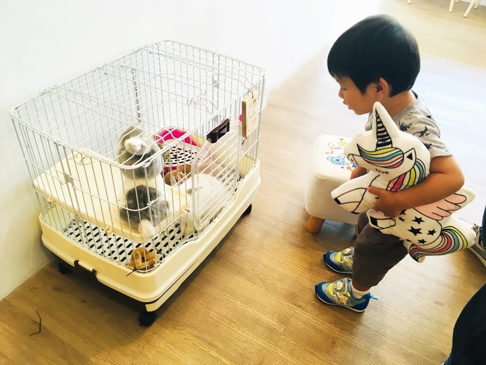 老闆養了一隻可愛的小白兔JB,據說是害羞的小女孩,小福寶對白色毛絨絨的小兔子很感興趣,一直觀察JB吃草、遊戲。