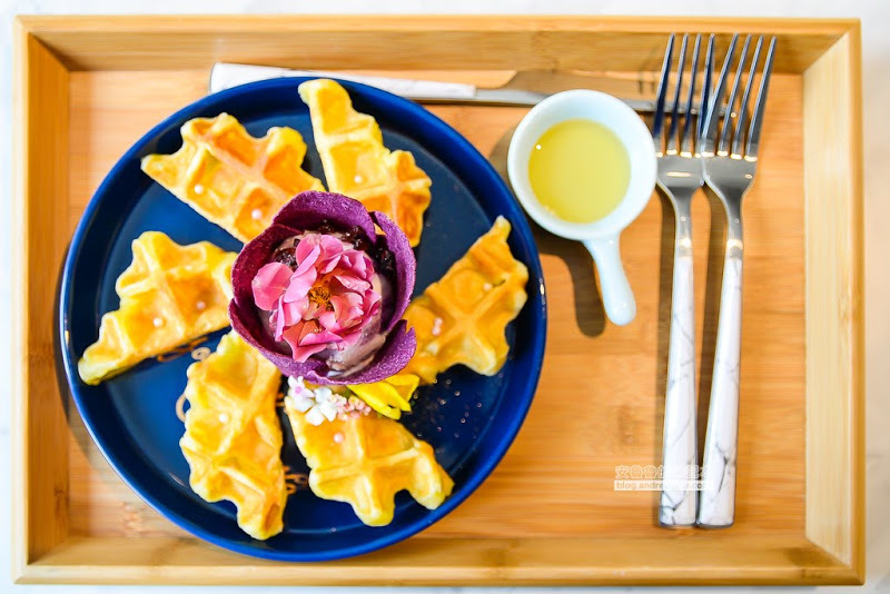 創意的擺盤,讓鬆餅、冰淇淋和紫薯片看起來就像是一朵盛開的花朵