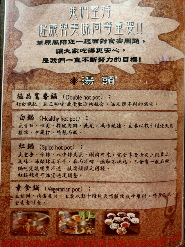先來說火鍋的靈魂,也就是湯頭!既然是蒙古火鍋,當然就是要傳承自蒙古才道地,草原風蒙古火鍋的湯底,就是老闆和闆娘特地去蒙古取經學回來的,很多香料也都是特別從蒙古引進台灣的喔!我們這次點的是鴛鴦鍋,白鍋和紅鍋湯底都是特別用老母雞、豬大骨熬煮5小時,再搭配數十種中藥材熬煮而成。
