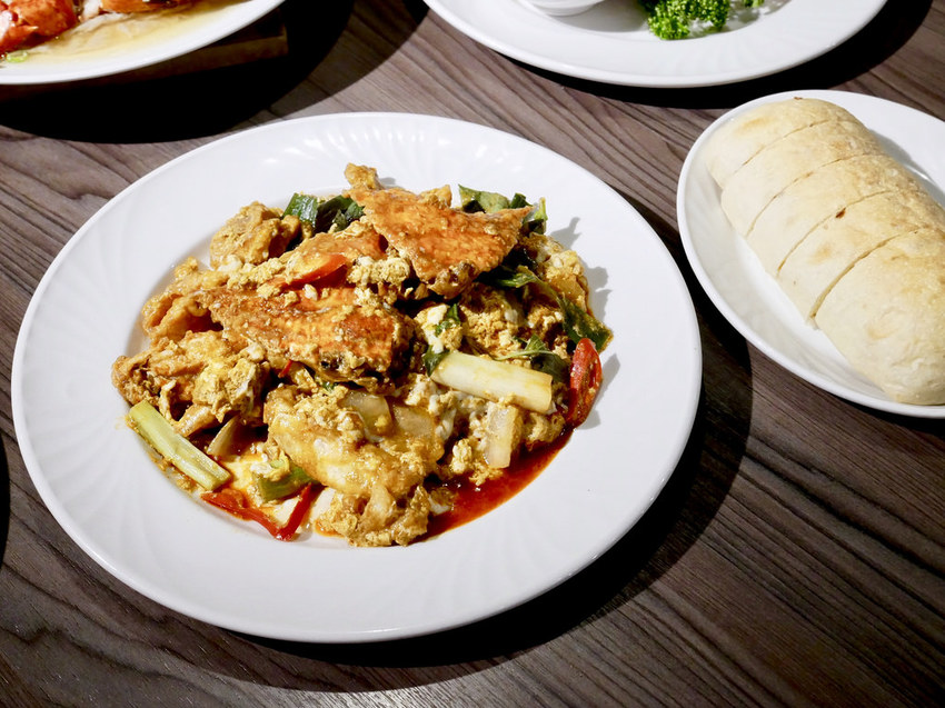 咖喱蛋炒蟹 – 藍花蟹、黃咖喱綠咖喱等特殊醬汁加入了生鴨蛋拌炒,搭配巧巴達麵包