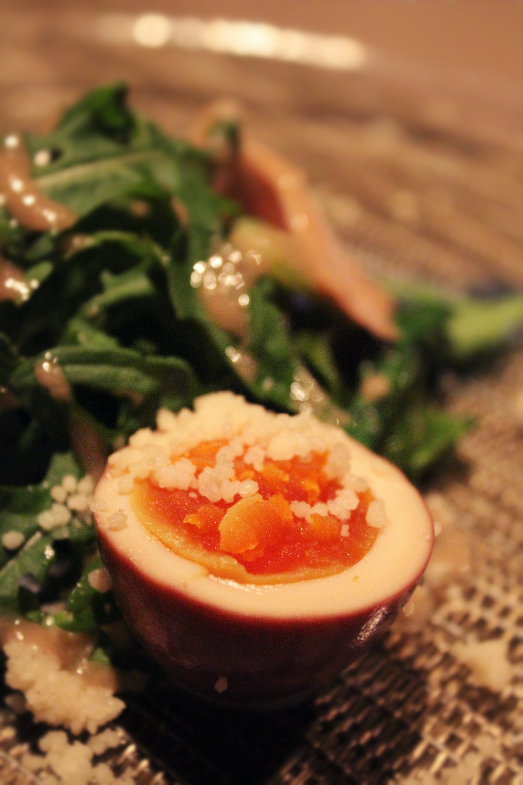 再來是烤松阪豬、糖心蛋、小米沙拉。松阪豬為脆的口感,再搭上有強烈滋味的芝麻葉,很棒。糖心蛋,很嫩很香,處理得非常好吃,糖心蛋是一種日式的處理手法,蛋白是熟的,蛋黃卻半生不熟,煮好的蛋,還得浸泡在滷汁中一整夜,才能散發迷人的滷蛋香。