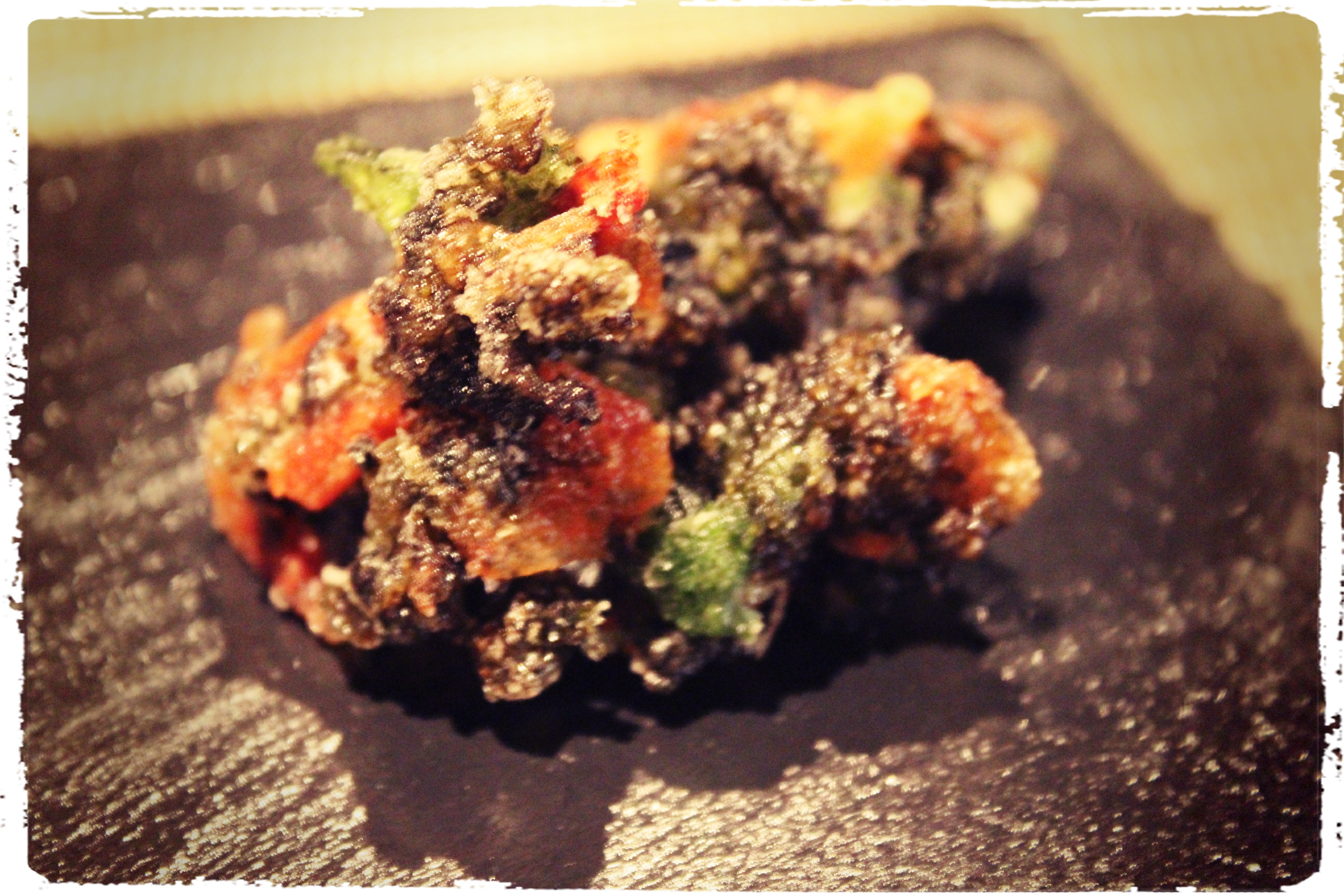 現在他所謂我們服務的是,為我們的散壽司,現場研磨油魚子,豐富的內容有白蝦、海膽、魚卵、生魚片、炙燒的比目魚鰭邊肉,比目魚鰭邊肉入口即化,壽司米特別使用了紫米、野米、泰國米制作,口感偏硬,但挺好吃的。