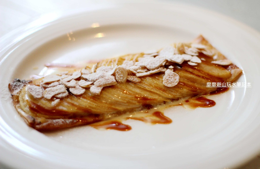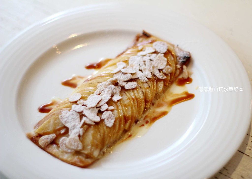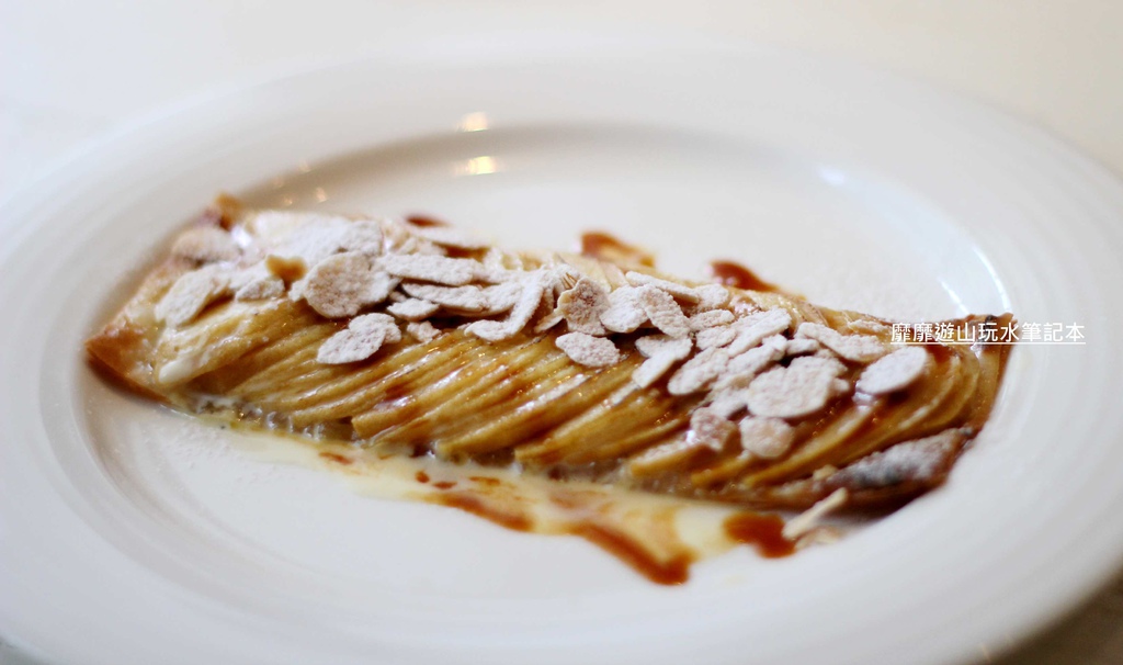 在軟Q的餅皮上鋪排了滿滿的蘋果片,最後再灑上杏仁片與糖粉還有甜蜜的醬汁~